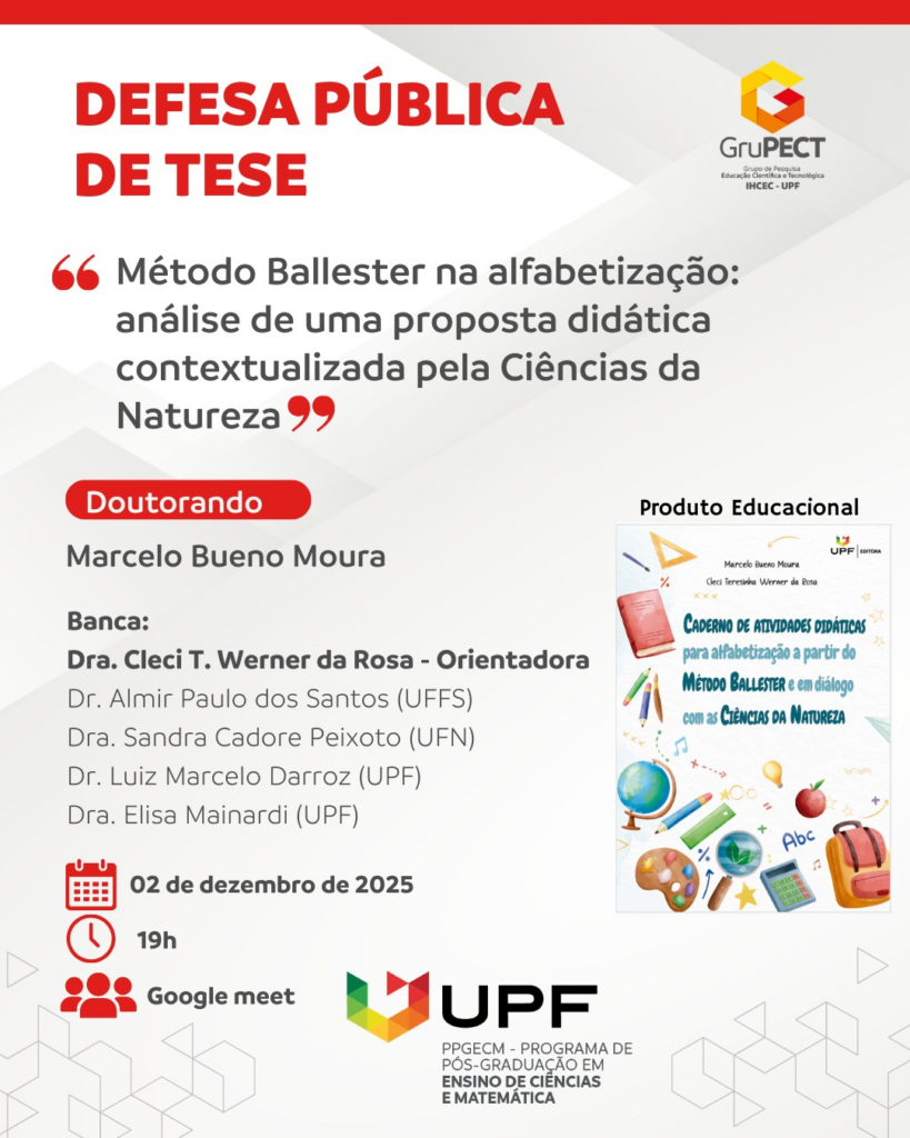 Marcelo Bueno Moura. Método Ballester na alfabetização: Análise de uma proposta didática contextualizada pela ciencias da natureza. Marcelo Bueno Moura. 2025. Orientadora: Profa. Dra. Cleci Teresinha Werner da Rosa. Tese (Doutorado em Ensino de Ciências e Matemática). Universidade de Passo Fundo, 2025.